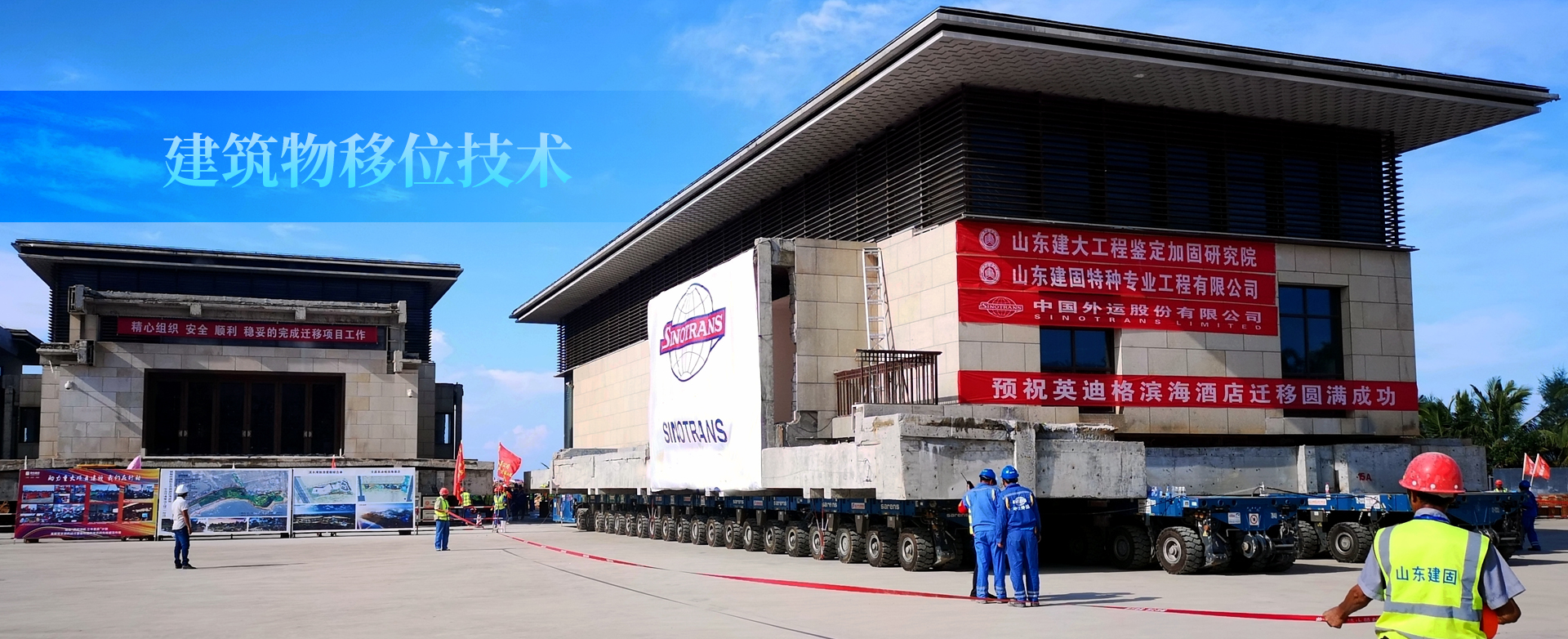 海南紅塘灣酒店為地下1層、地上2層鋼筋混凝土框架結(jié)構(gòu)。占地面積約2400㎡,總建筑面積4658㎡。遷移直線距離約500米,豎向頂升2.3米。紅塘灣酒店遷移工程的成功就位,標(biāo)志著一個新的記錄誕生:目前國內(nèi)外首例不規(guī)則扇形車輛布置、國內(nèi)拖車移位單體建筑面積最大(4658㎡)、國內(nèi)拖車移位單體建筑重量最重(7500噸)。山東建筑大學(xué)工程鑒定加固研究院、山東建固特種專業(yè)工程有限公司成立于1992年,三十年一直秉承“篤志疑難躬行求新”的企業(yè)精神,完成建筑物鑒定與加固改造、建筑移位、建筑糾傾項目六萬余項。山東萊蕪高新區(qū)辦公樓平移項目,建筑面積24000㎡,重量35000噸,是國內(nèi)外最重平移工程;主持完成的